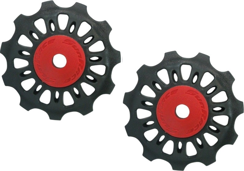 Sunrace SP856 derailleur wheels Specifications: Colour: black, red Material: plastic Number of teeth: 11 Hole diameter: 5 mm Weight: 21 grams Ceramic: no Contents: 2 Derailleur wheels