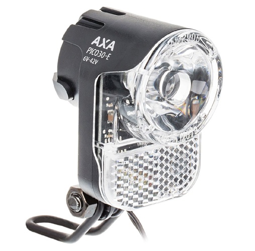 Axa Pico 30-E Switch Headlight The AXA Pico30-E is a mini power pack with a light output of 30 lux. The compact and slim design is an asset on sporty bikes. The Pico30-E has an integrated retro-reflector. This function significantly increases your safety in traffic. The robust stainless steel bracket is suitable for any road type, but can also be replaced by a semi-integration bracket with the most common forks. Specifications: Color: black Housing material: Plastic Mounting bracket material: Steel Type of lighting: led Power supply: 6V – 42V e-bike battery Position: front fork Range: 60 meters see, 3500 meters be seen Lamp size: 60 x 35 mm Illuminance: 30 lux German quality mark: K905 French quality mark: TPLBi 12079
