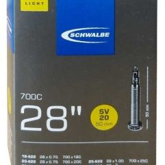 Schwalbe SV20 extra light inner tube Specifications: Color: black Material: rubber Weight: 65 grams Valve type: French valve Valve length: 40 mm Inch size: 28 x 0.75 28 x 0.90 28 x 1.00 27 x 7/8 27 x 1.00 ETRTO size: 18-622 20-622 22-622 23-622 25-622 22-630 25-630
