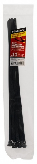 Zenitech reusable cable ties These cable ties can be reused, how handy is that? Specifications: Color: black Material: plastic Dimensions: 7.6 x 370 mm Reusable: yes Number of pieces: 10 Content: 10 Cable ties