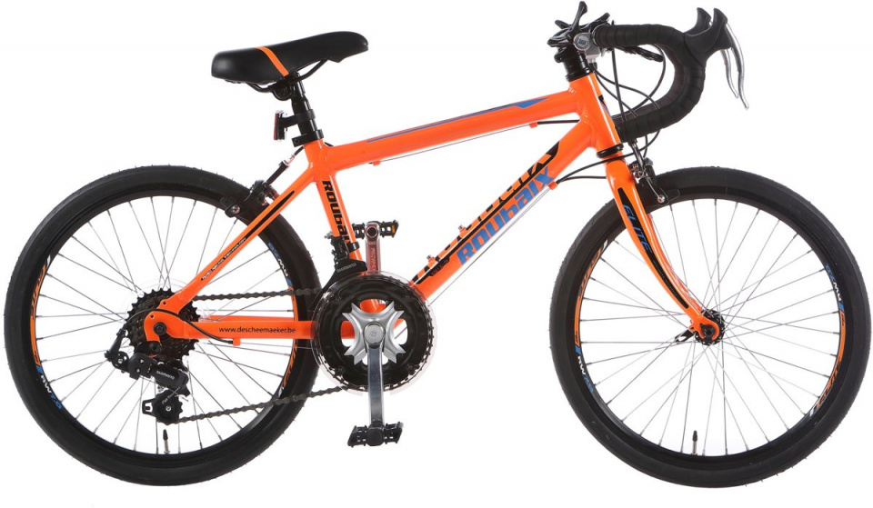 Elite Roubaix racing bike If your little one is a real cycling fanatic, this racing bike is exactly what he/she is looking for! The Roubaixmodel has Elitebeen developed so that the very young talents can go as fast as possible. The combination of colours used gives a timeless impression to the hip model. The bike has 14 gears, aluminum brakes and extra right hand brake handle for the little ones. Get on this road bike and set your best time ever! General specifications: Gender: boys Colour: orange Frame material: aluminium Rim material: aluminium Colour rims: black Wheel size: 20 inch Frame size: 30 cm Handlebar stem: fixed, aluminium Seat post sprung: no Front fork suspension: no Weight: 11 kg Gear specifications: Gears: 14 speed (Shimano Tourney) Gear type: derailleur Brake specifications: Front brake type: cantilever Rear brake type: cantilever
